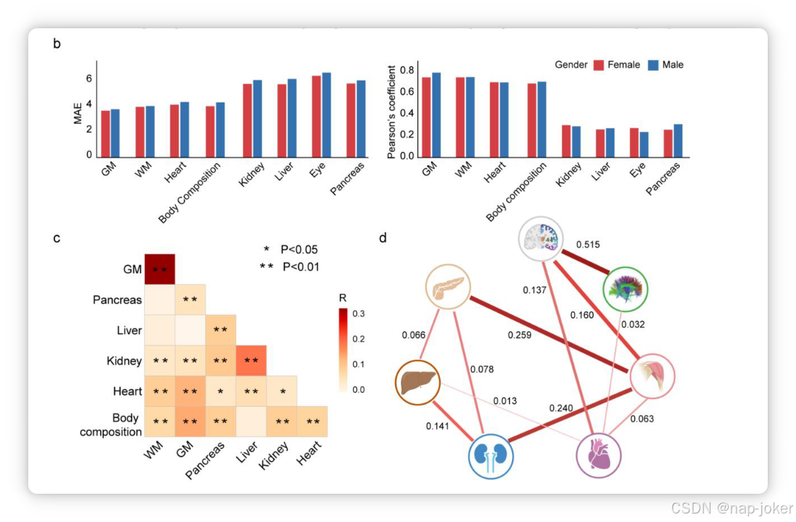 图2 多器官衰老模型的性能。(a)散点图展示了八个不同器官的时间年龄与预测年龄之间的关联。黑色实线表示最合身的型号。选用皮尔逊系数(R)和均方误差(MAE)来衡量器官年龄预测模型的性能。(b) 与A相似,但按性别分层,以考察器官年龄预测模型的潜在性别差异。 不同性别以不同颜色展示。(c) 器官年龄差被定义为差异介于预测年龄和按时间年龄之间。皮尔逊对不同器官年龄差关联系数显示,颜色越深代表关系较高,* < 0.05, ** < 0.01。 (d) 多器官衰老网络描述了器官年龄差距与器官之间的统计关联。SEM在Bonferroni校正P <阈值(0.05/11对)时推断出显著关联,粗暗线代表更强影响。