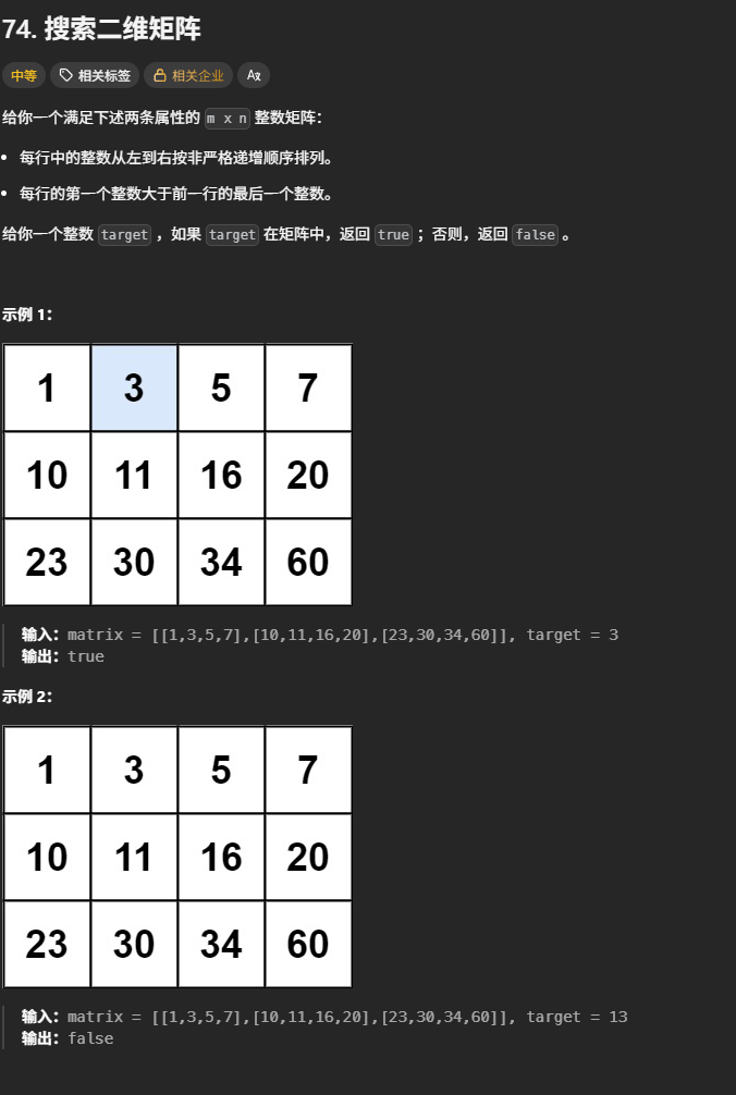 我们可以对矩阵的第一列的元素二分查找,找到最后一个不大于目标值的元素,然后在该元素所在行中二分查找目标值是否存在。