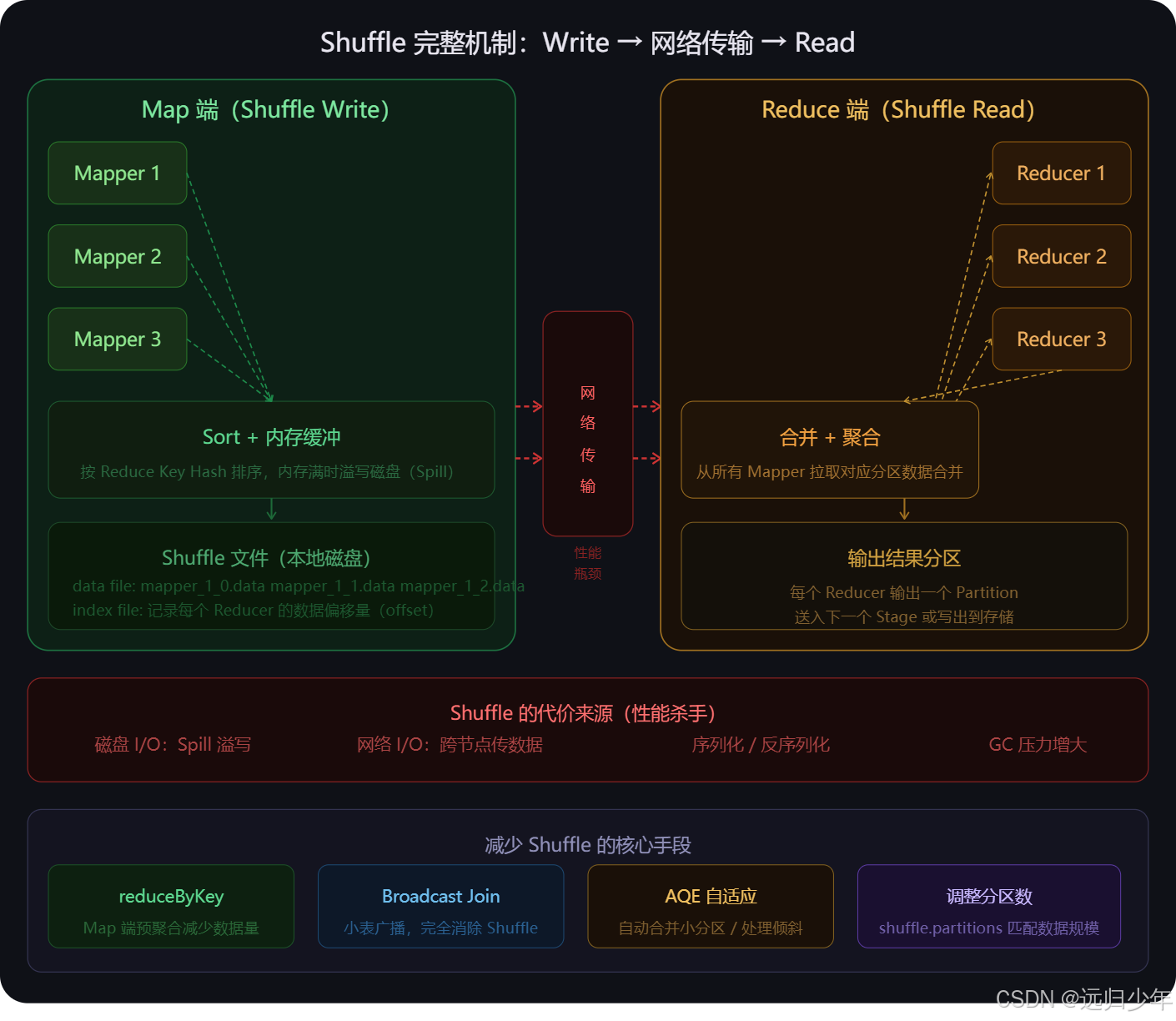 - 代价来源有四个:Spill 溢写磁盘、跨节点网络传输、序列化反序列化、GC 压力。