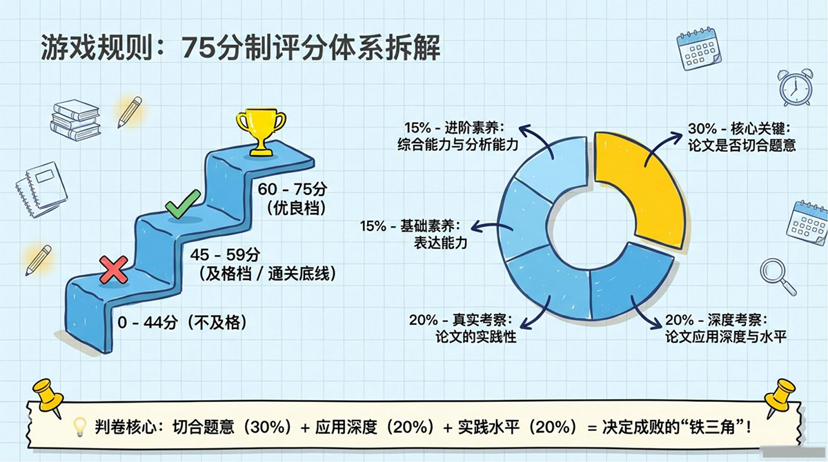 从评分标准可见,以下三个方面直接决定了论文的成败: