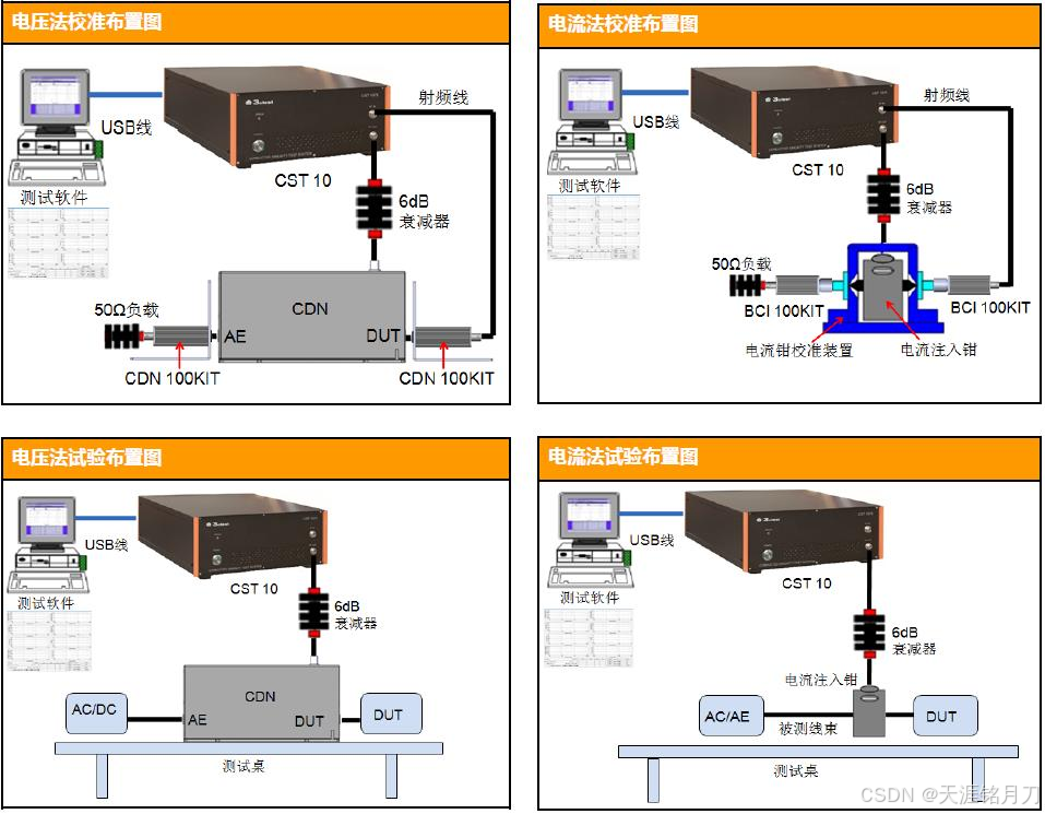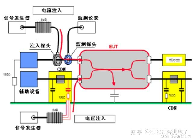 注入方式:根据线缆类型,依次对电源线、信号线通过CDN或注入钳施加干扰。