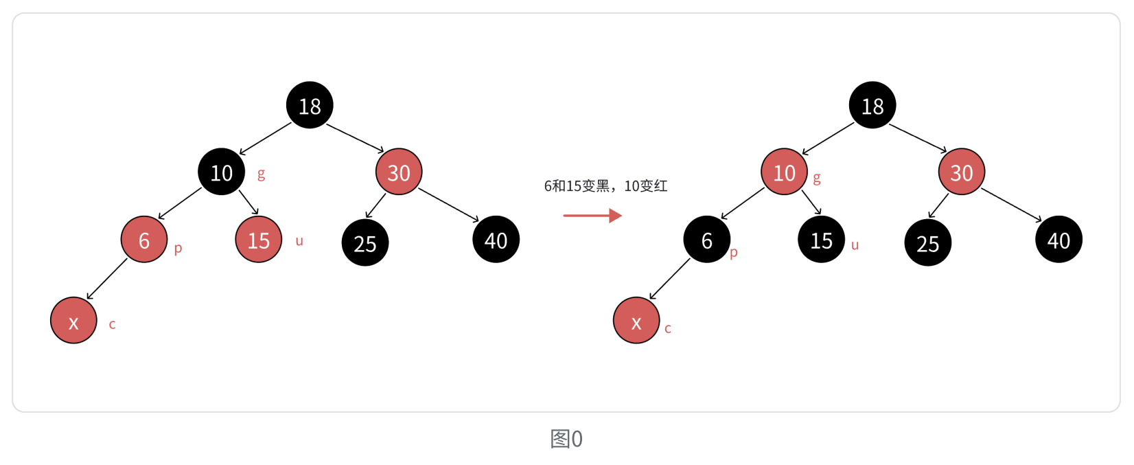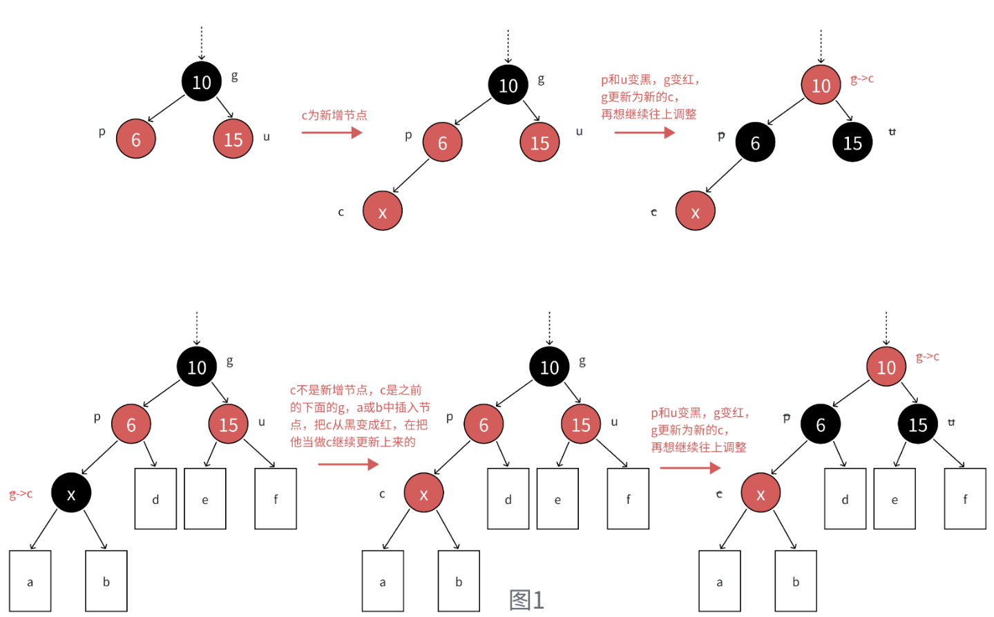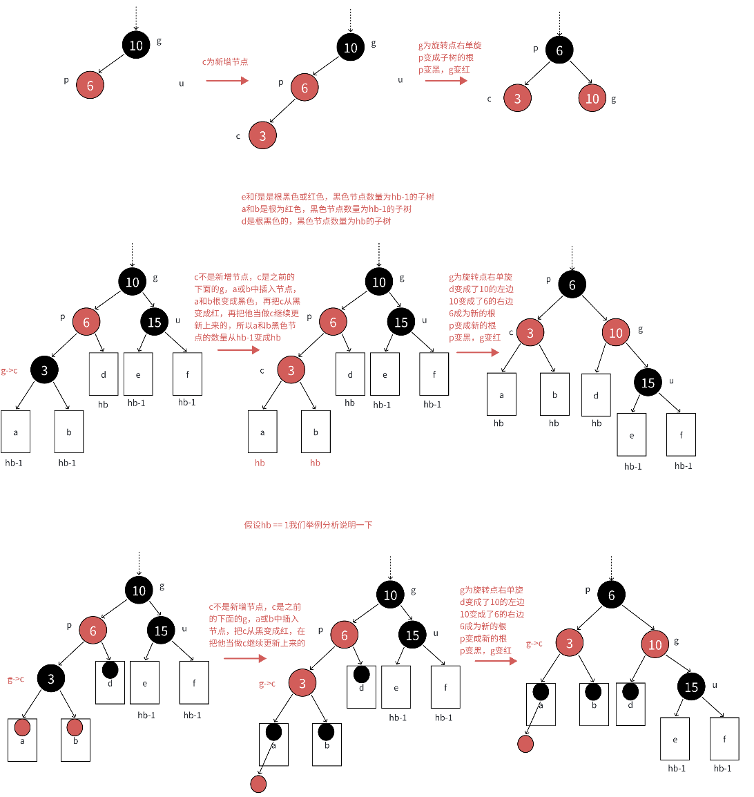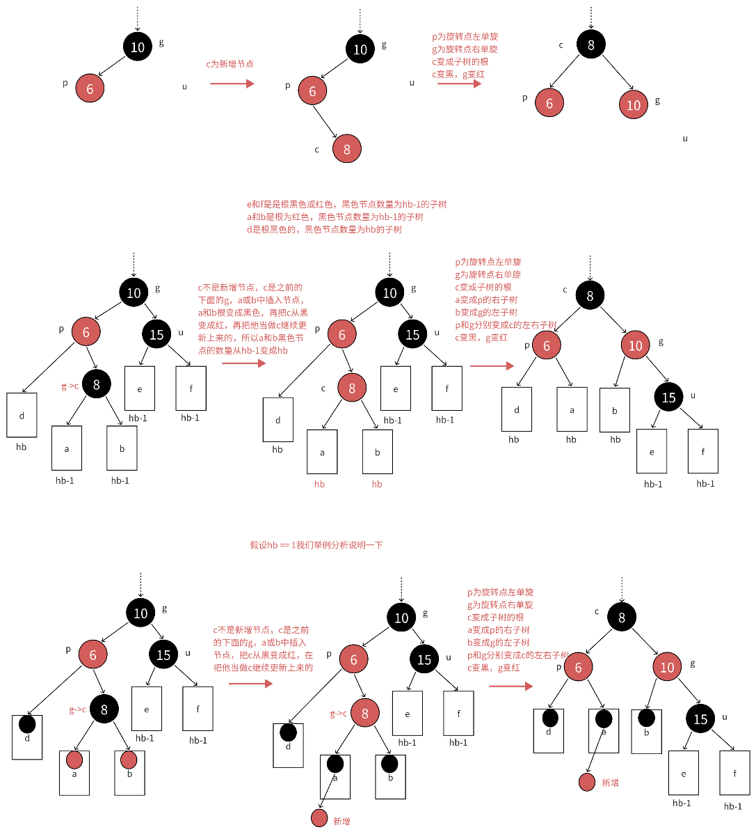 c为红,p为红,g为⿊,u存在且为红,则将p和u变⿊,g变红。在把g当做新的c,继续往上更新。