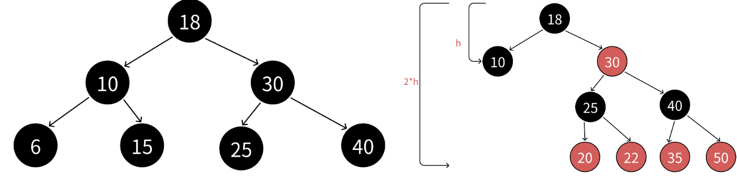 - 由规则2和规则3可知,任意⼀条路径不会有连续的红⾊结点,所以极端场景下,最⻓的路径就是⼀⿊⼀红间隔组成,那么最⻓路径的⻓度为2*bh。