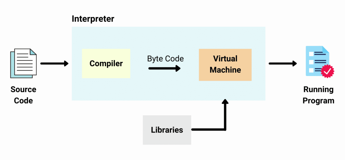 源代码先被编译为字节码,再由 Python 虚拟机执行字节码,过程中依赖 Python 库完成底层功能,最终形成可运行的程序。