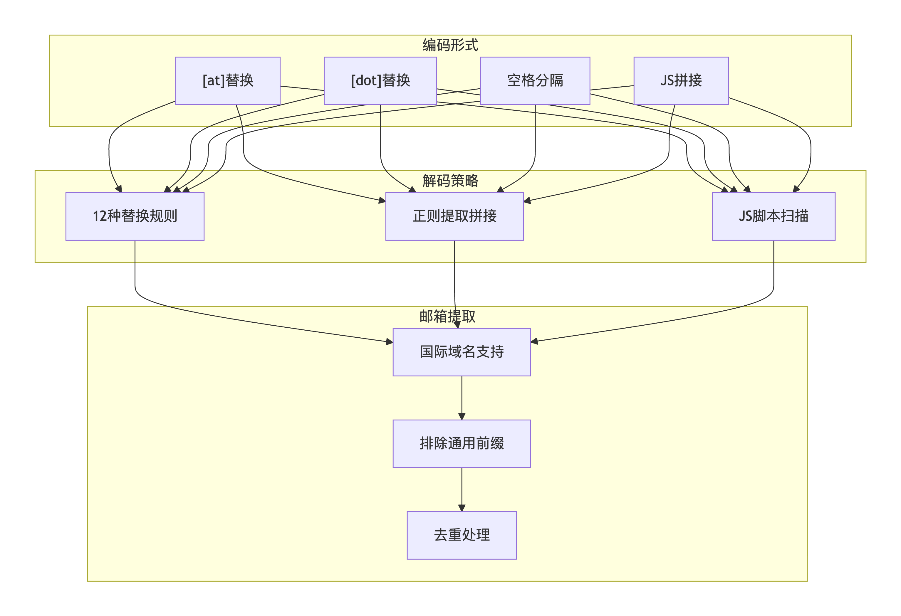 在缅甸语网页中,为防止爬虫,邮箱常被编码为[at]和[dot]形式,甚至通过JavaScript拼接。需要实现全面的解码策略。