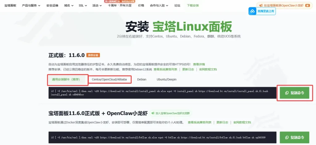 点击立即免费安装,来到命令复制处,可以选择通用的复制,也可以选择对应服务器系统复制命令,如图