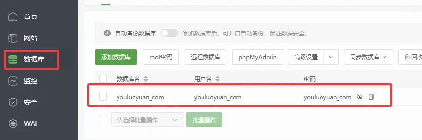 来到宝塔数据库选项,刚才创建站点我将数据库名称、账号、密码都设置为了"youluoyuan_com",如图