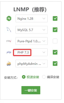 登录宝塔后,这里选择PHP7.3,一键安装即可,如图