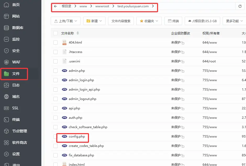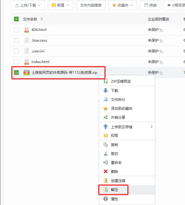 来到创建的目录/www/wwwroot/test.youluoyuan.com下,将源码"土拨鼠网页软件库源码-带1153条资源.zip"拖动上传,如图