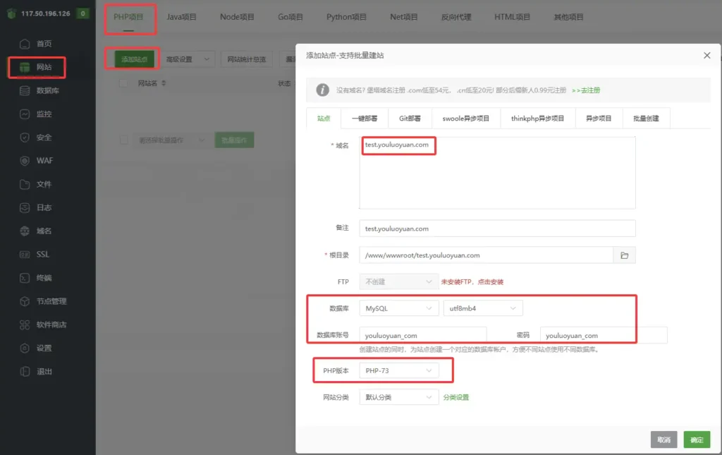 点击网站-PHP项目-添加站点,输入自己已经解析的域名,没有域名直接填写IP也可以,然后选择MySQL数据库,设置账号密码,PHP版本7.3,然后点击确定,如图