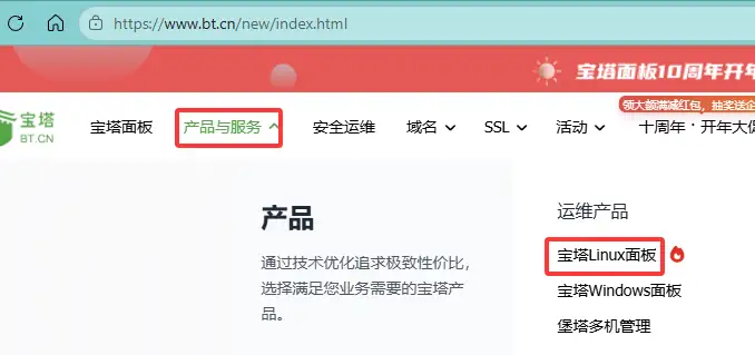 在宝塔官网的"产品与服务"选项下选择"宝塔Linux面板",如图