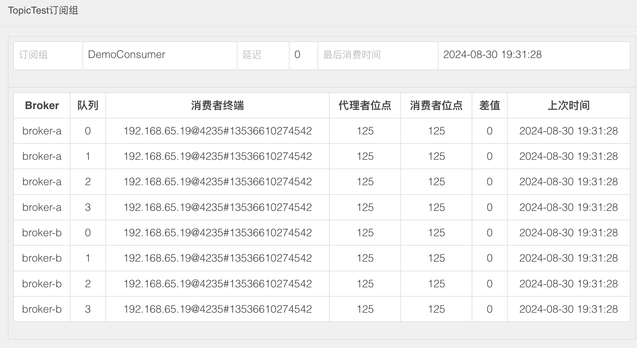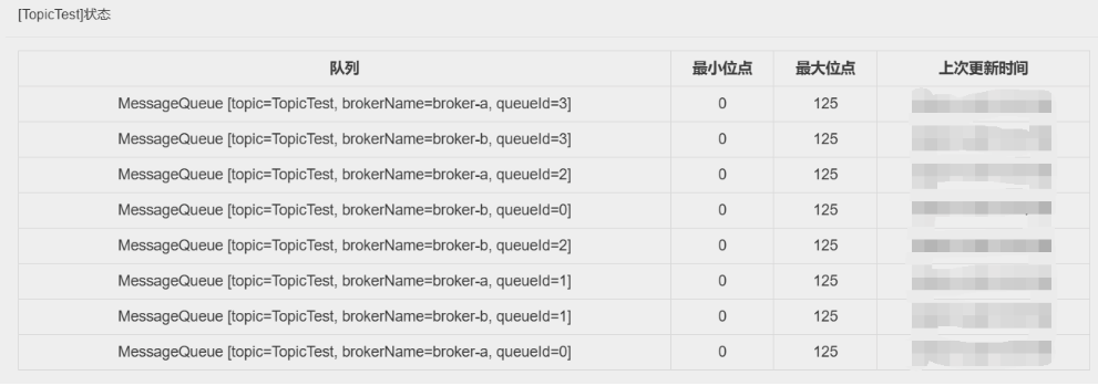 从Dashboard就能看到,每一个MessageQueue,当前都记录了125条消息。也就是说,之前使用Producer示例往RocketMQ中发送的一千条消息,就被均匀的分配到了这八个MessageQueue上。