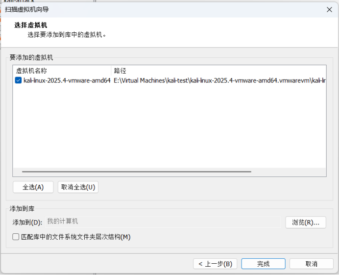 打开VMware → 文件 → 扫描虚拟机 → 选择你解压的文件夹 → 勾选Kali虚拟机 → 完成。