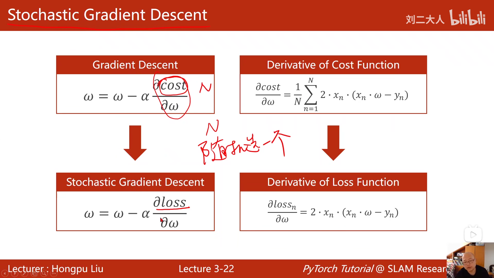 随机梯度下降不再在每轮的迭代中求平均梯度,平均损失,而是转化为在每次迭代中分别针对每个数据求梯度和损失。