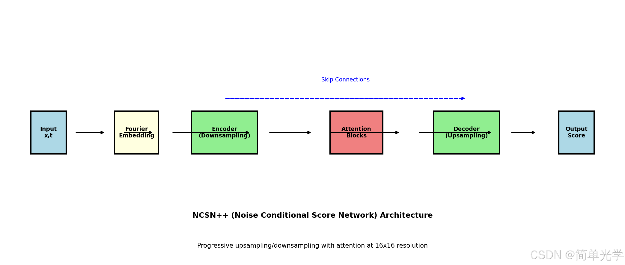 图4:NCSN++网络架构。采用U-Net结构,包含编码器-解码器、跳跃连接和注意力机制。