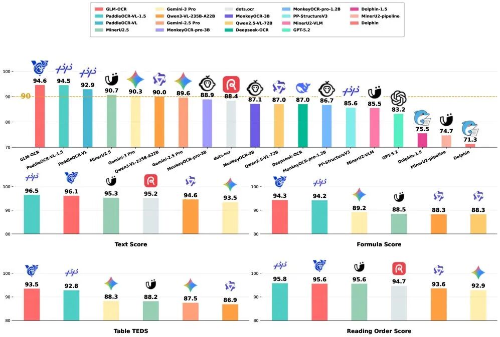 在数字化转型的浪潮中,文档智能处理已成为企业提升效率的关键环节。无论是财务部门处理海量发票,还是科研人员数字化学术论文,OCR(光学字符识别)技术 都扮演着不可或缺的角色。然而,传统 OCR 技术长期面临着一个两难困境:高精度模型往往参数量巨大、部署成本高昂,而轻量级模型又难以应对复杂场景。智谱 AI 开源发布的 GLM-OCR 模型 打破了这一僵局,以仅 0.9B 的参数量 实现了业界领先的文档解析能力,在权威榜单 OmniDocBench V1.5 中以 94.6 分取得 SOTA 性能,成为 OCR 领域的一次重要技术突破。