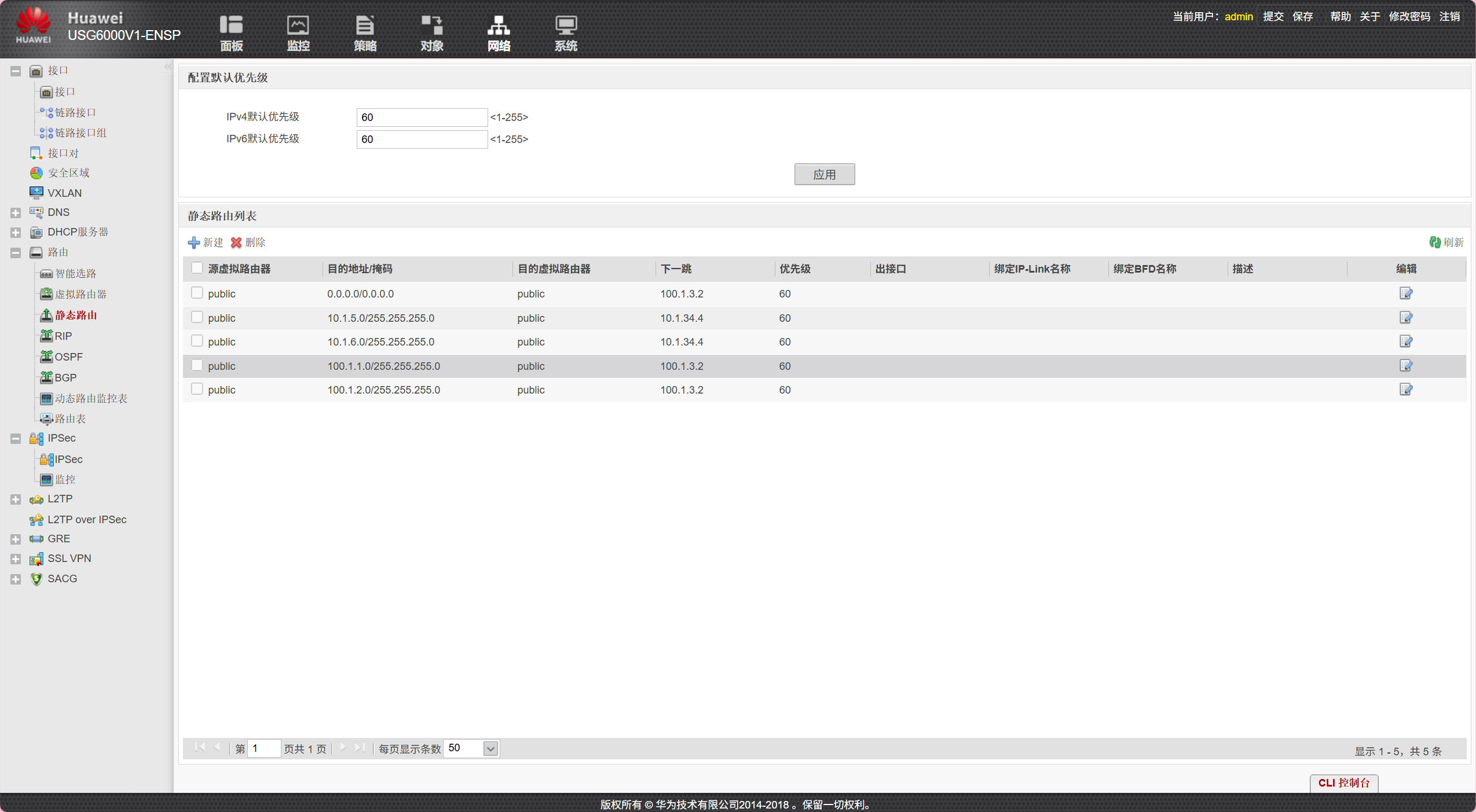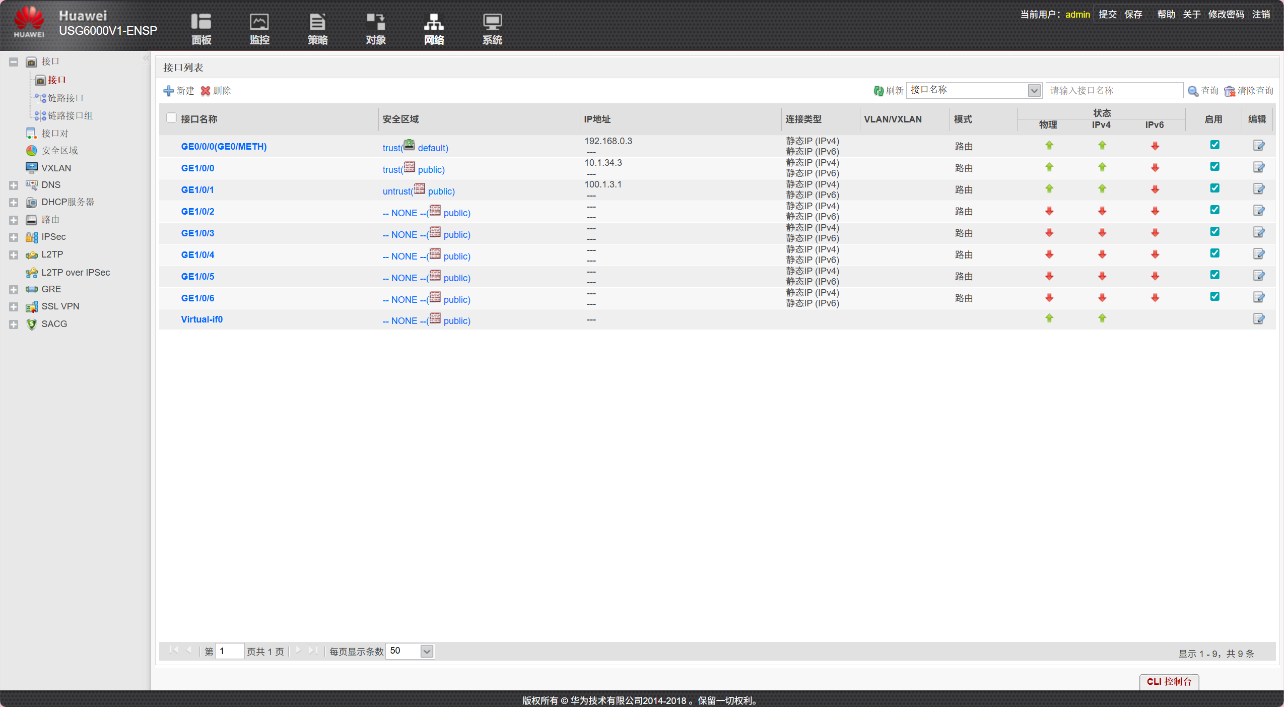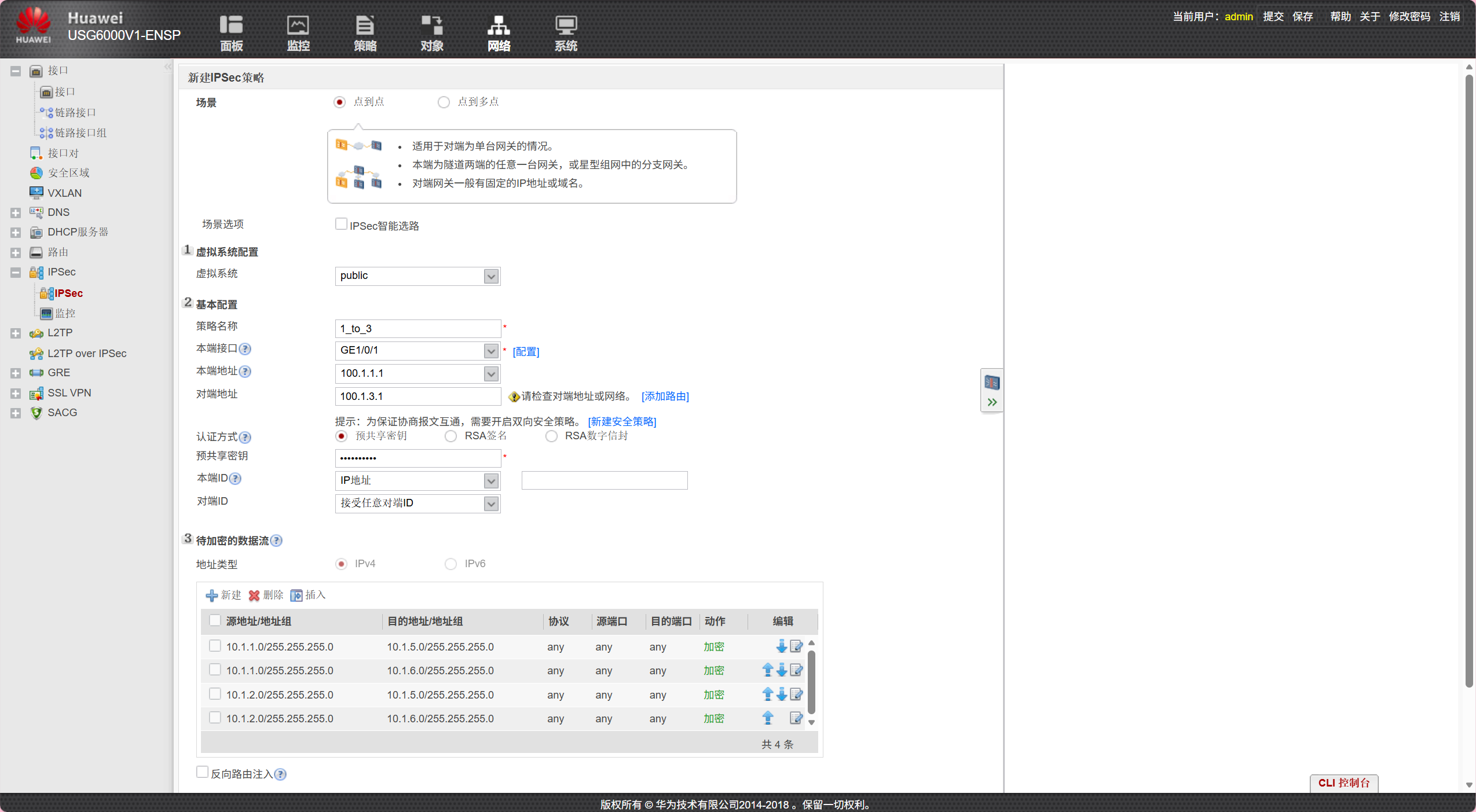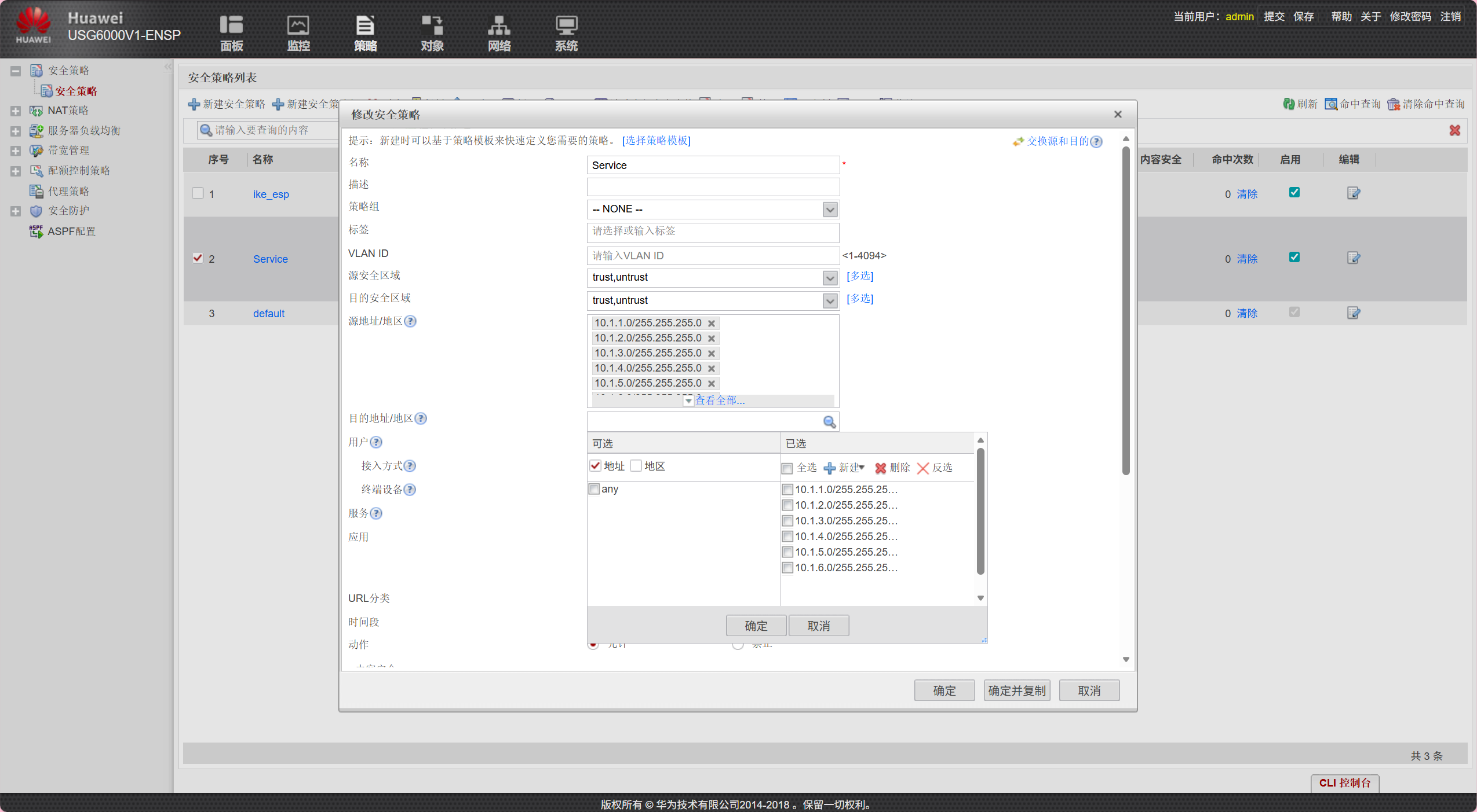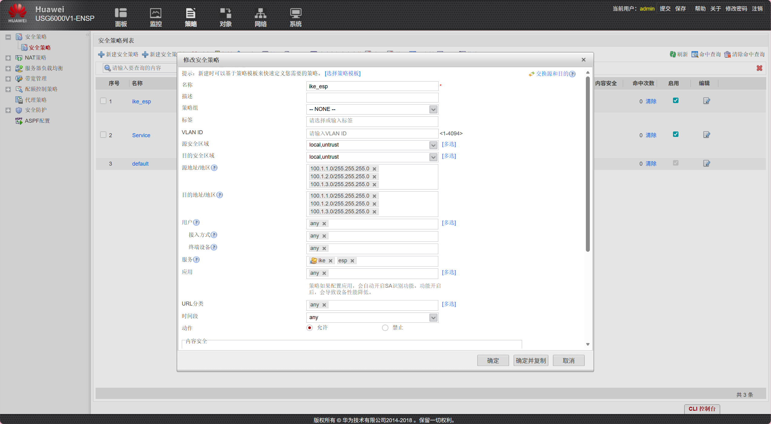 b.防火墙策略配置(三台防火墙均可以如下配置)