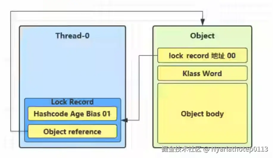 - 轻量级锁 :当有少量线程交替竞争(即竞争不激烈,没有同时抢)时升级为此状态。它通过CPU的CAS操作在对象头和线程栈帧中复制、替换锁记录来实现同步,避免了操作系统级互斥量(Mutex)的阻塞开销。