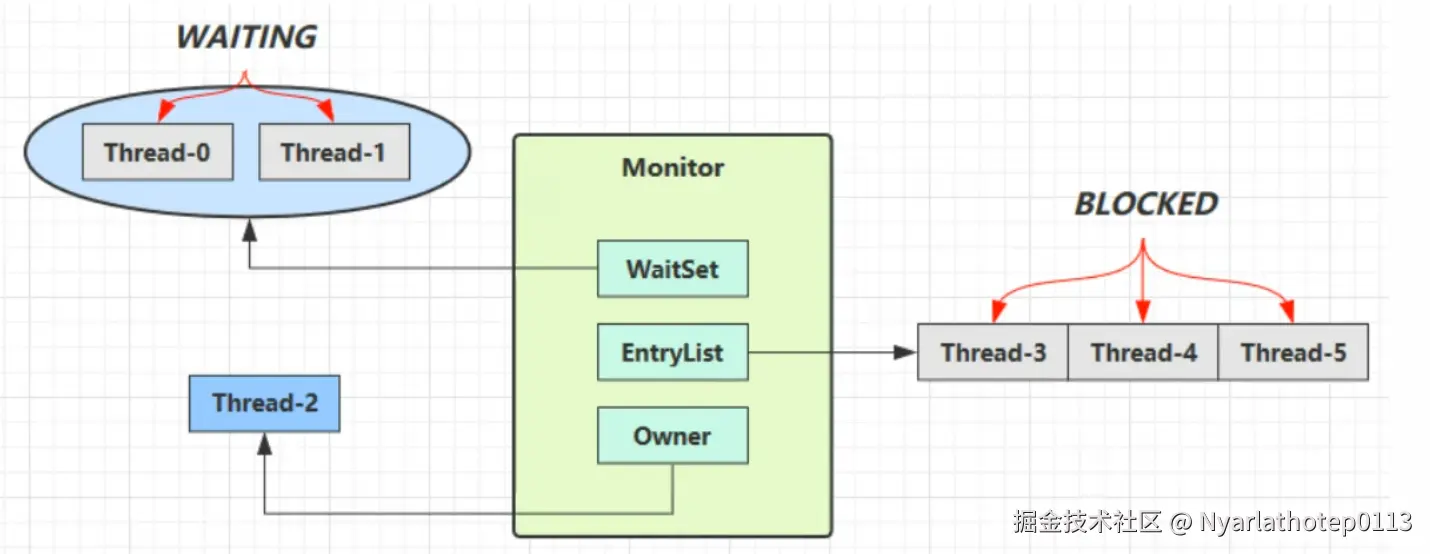 Owner:当前持有锁的线程Entry Set:等待获取锁的队列Wait Set:调用wait方法后进入等待状态的线程队列- 其他组件: