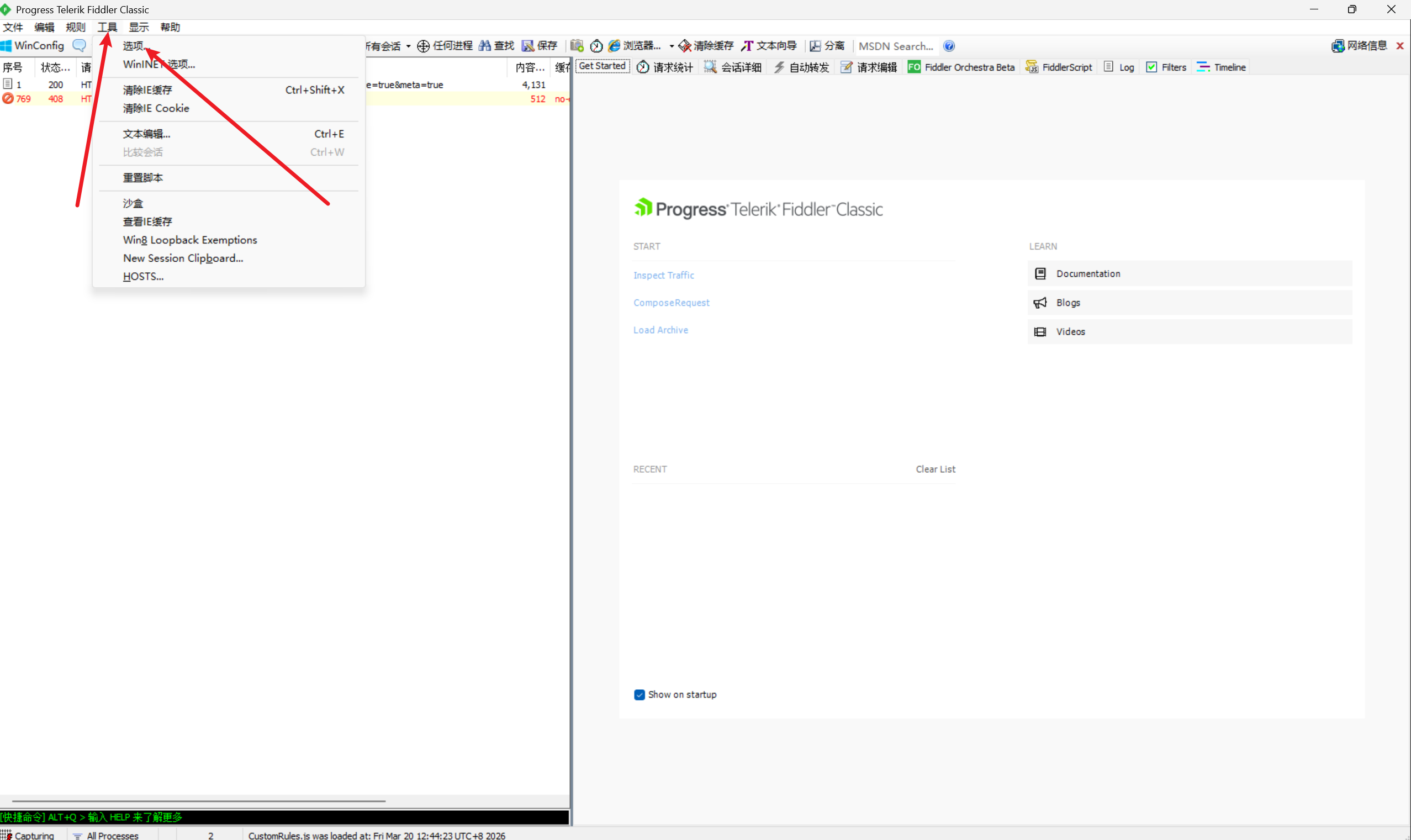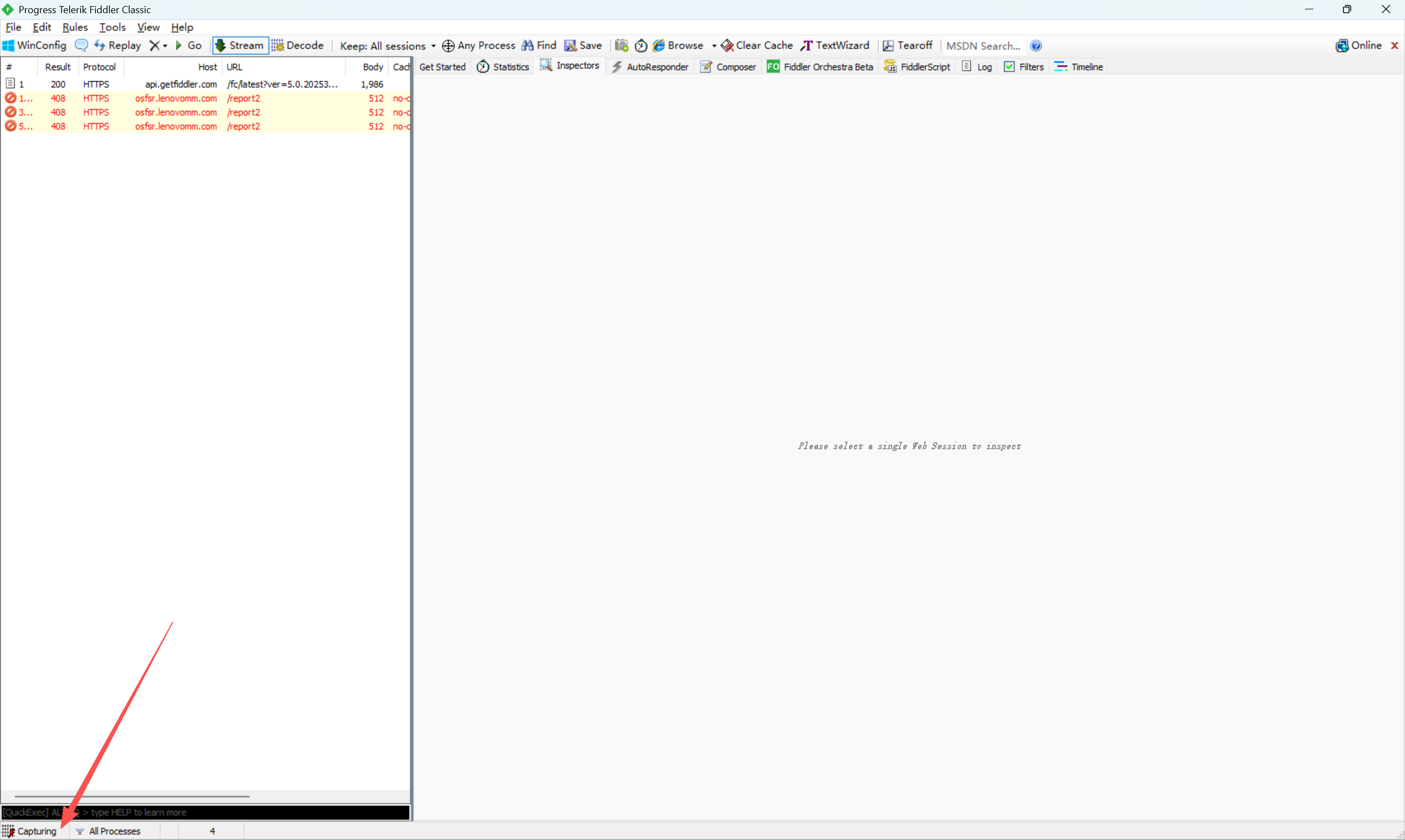 开启抓包:确保Fiddler左下角「Capturing」为亮色(点击可切换开启/关闭);