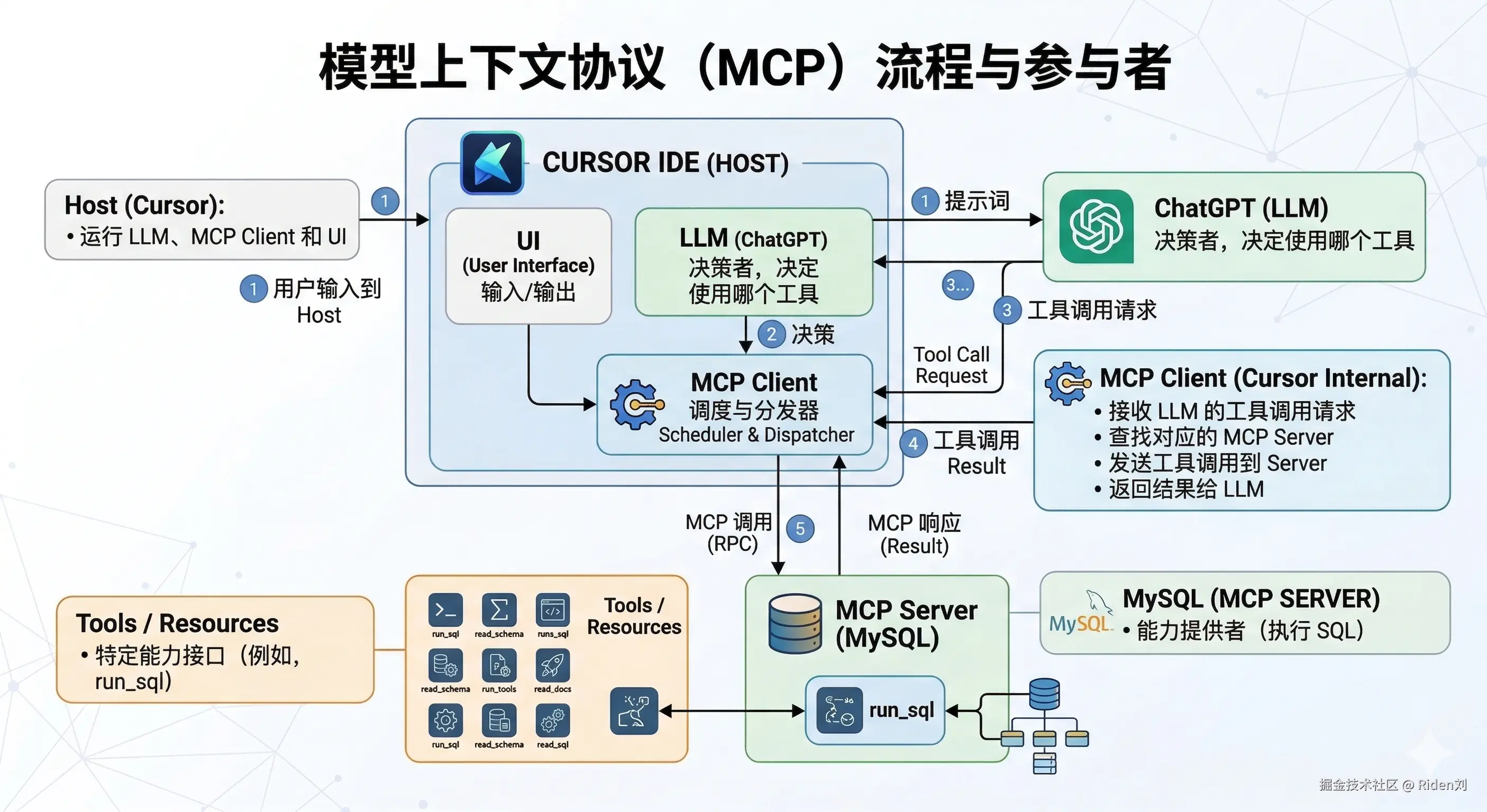 - MCP Client(Cursor 内部) :调度者,负责: