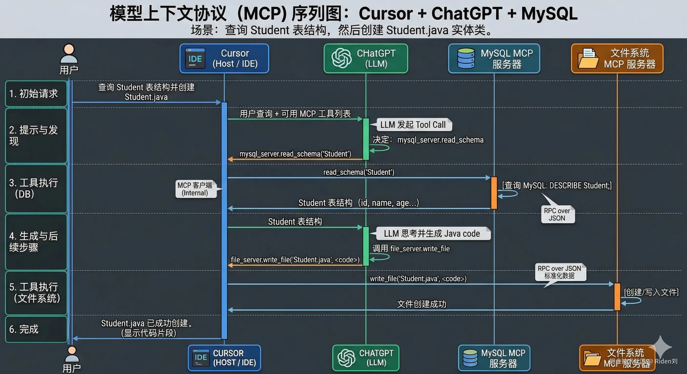 MySQL.run_sql("DESCRIBE Student")。 - ChatGPT 把请求的JSON 发给 Cursor,Cursor 就会找到内部对应的 MCP Client,MCP Client 就会和 MCP Server 通信,拿到结果,然后返回给 ChatGPT。