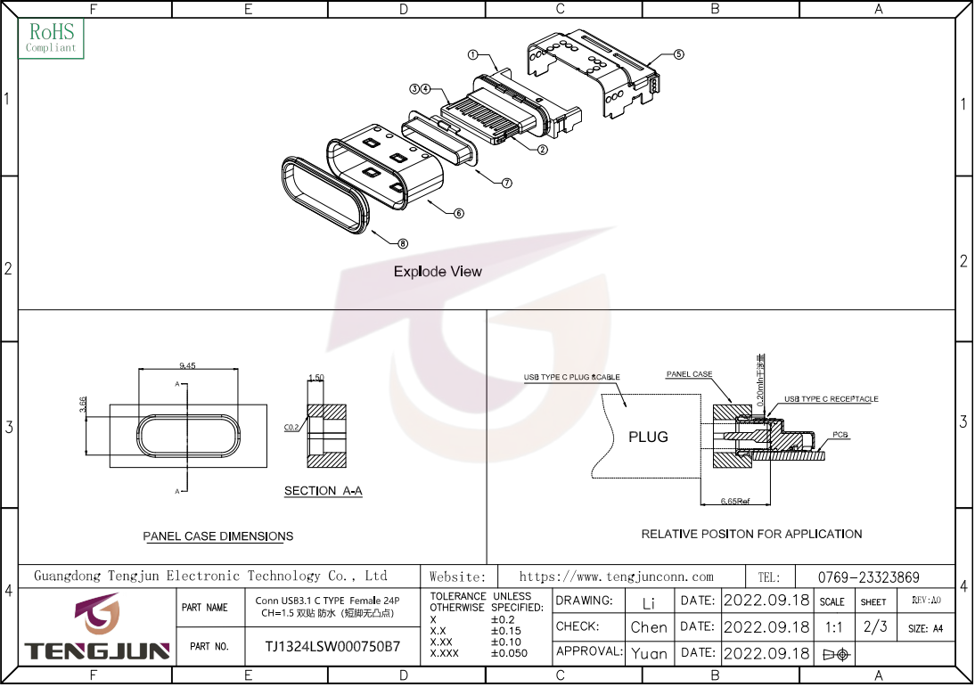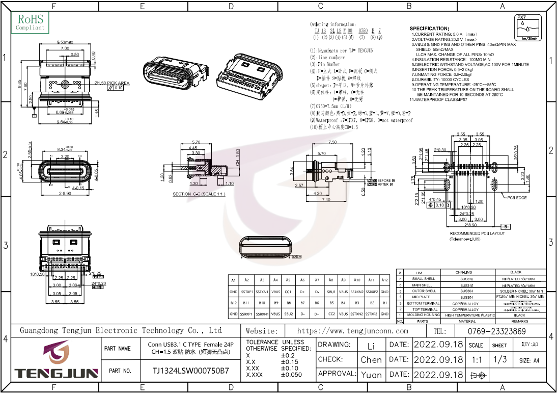 TENGJUN:TJ1324LSW000750B7为板上双排贴防水Type‑C 24PIN母座,通过USB‑IF TID认证+EN IEC 62680标准,满足欧盟与全球通用接口合规要求,面向工业控制、车载、医疗、户外终端、三防设备等严苛场景,提供高可靠、防水、强结构的板端连接解决方案,可直接对标并替代国际品牌同规格物料。