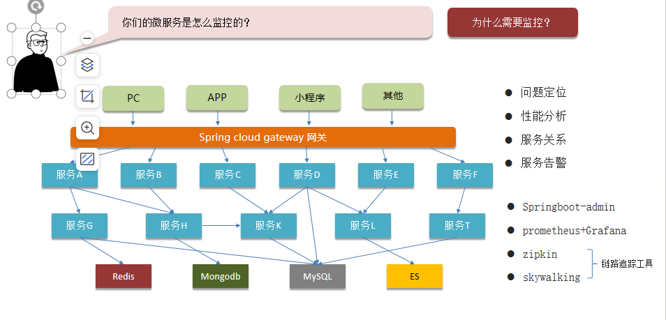 我们项目中采用的skywalking进行监控的 1,skywalking主要可以监控接口、服务、物理实例的一些状态。特别是在压测的时候可以看到众多服务中哪些服务和接口比较慢,我们可以针对性的分析和优化。 2,我们还在skywalking设置了告警规则,特别是在项目上线以后,如果报错,我们分别设置了可以给相关负责人发短信和发邮件,第一时间知道项目的bug情况,第一时间修复