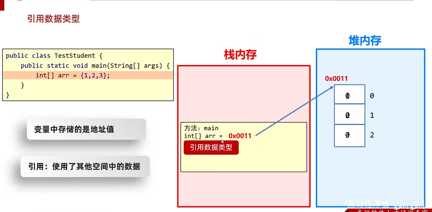 数组的格式是int[] arr = new int[]{1,2,4,6,88,9,45,6};其中是在栈终main方法里面,而 new int[]{1,2,4,6,88,9,45,6};是在堆内存中的,如果想要获取数据就要先通过arr找到堆内存中对应的地址值,然后在通过索引找到对应的数据