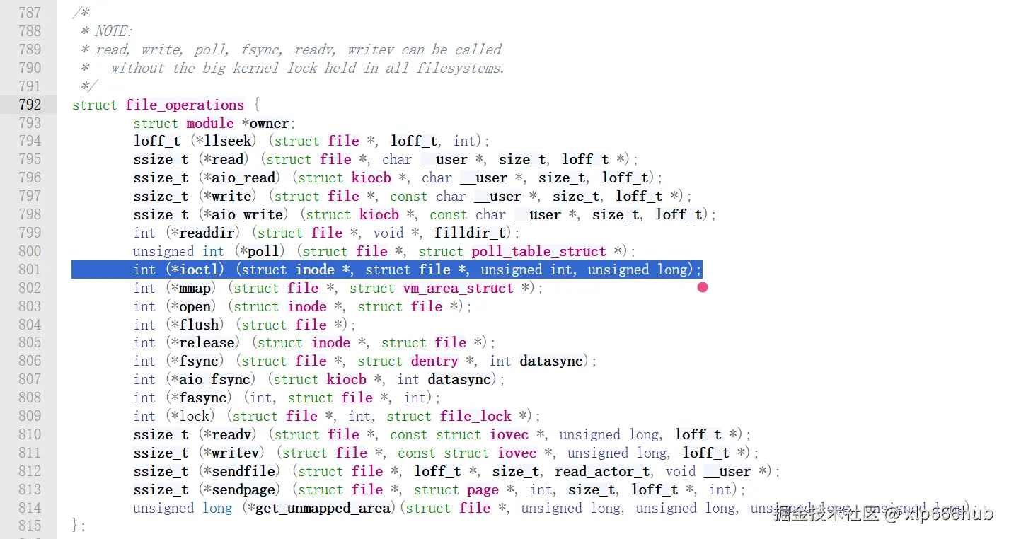 值得一提的是,在老版本的 Linux 内核中,这个回调函数就叫做 ioctl,并且它受到 大内核锁 BKL 的保护,如下图,Linux 内核版本 v2.6.0 的 file_operations: