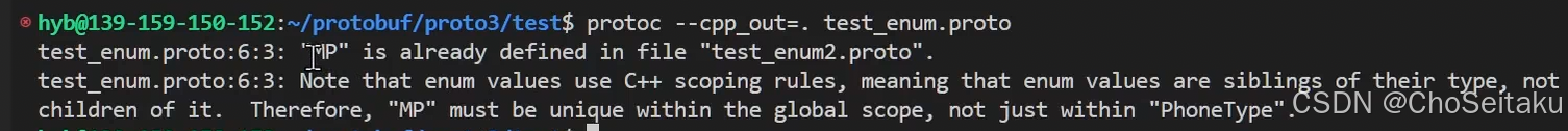 将两个'具有相同枚举值名称'的枚举类型放在单个.proto⽂件下测试时,编译后会报错:某某某常量已经被定义!所以这⾥要注意: