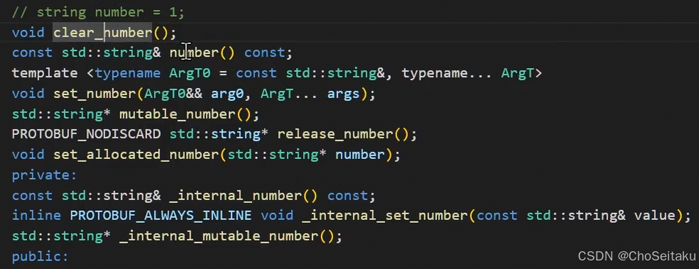 - 每个字段都有设置和获取的⽅法,获取⽅法的⽅法名称与⼩写字段名称完全相同。但如果是消息类型的字段,其设置⽅法为mutable_⽅法,返回值为消息类型的指针,这类⽅法会为我们开辟好空间,可以直接对这块空间的内容进⾏修改。