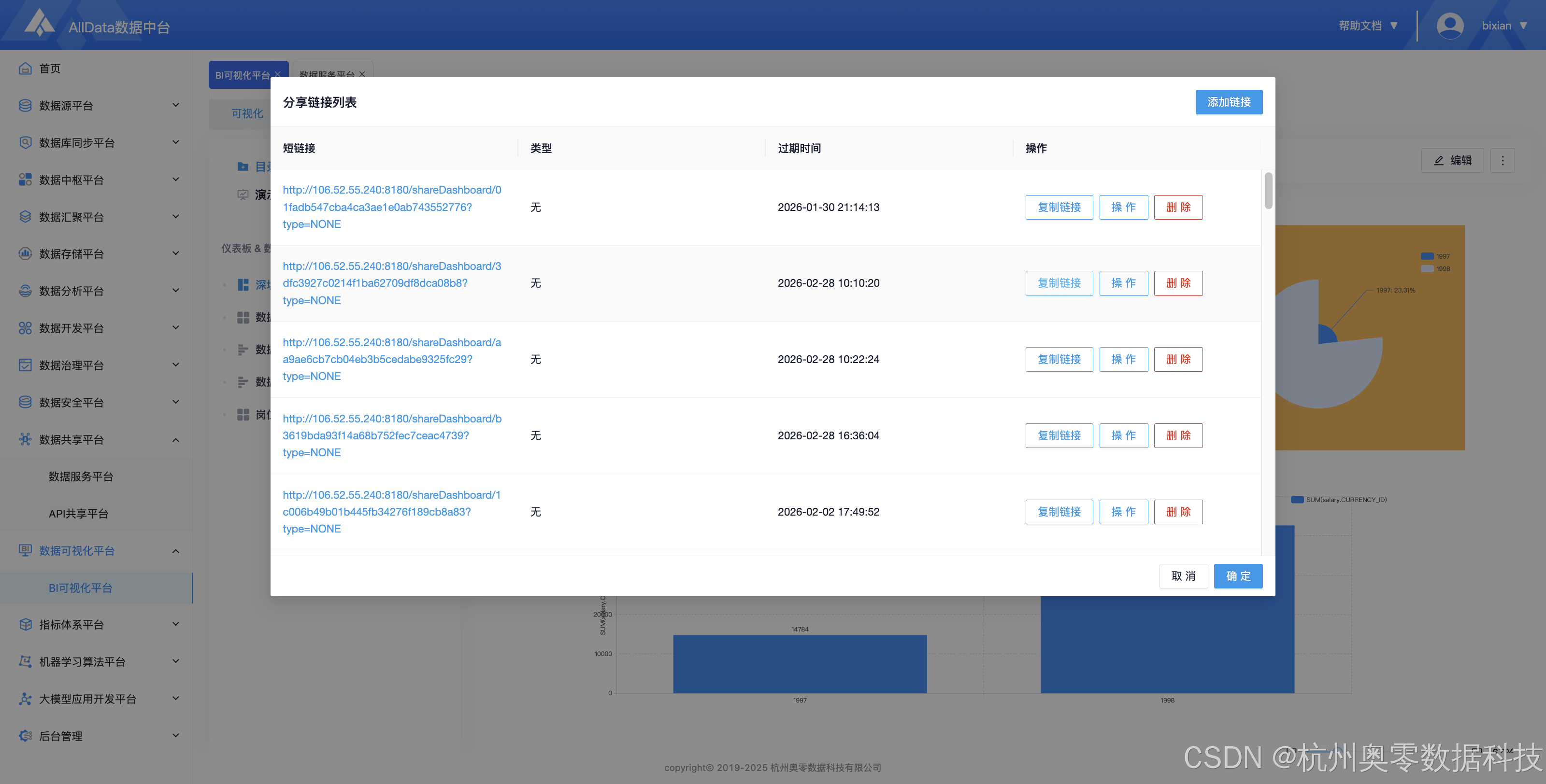 (2)完成后该链接会根据新建方式生成对应链接,需要密码的会自动生成密码,点击复制链接在其他浏览器中打开即可查看数据视图。![]() |