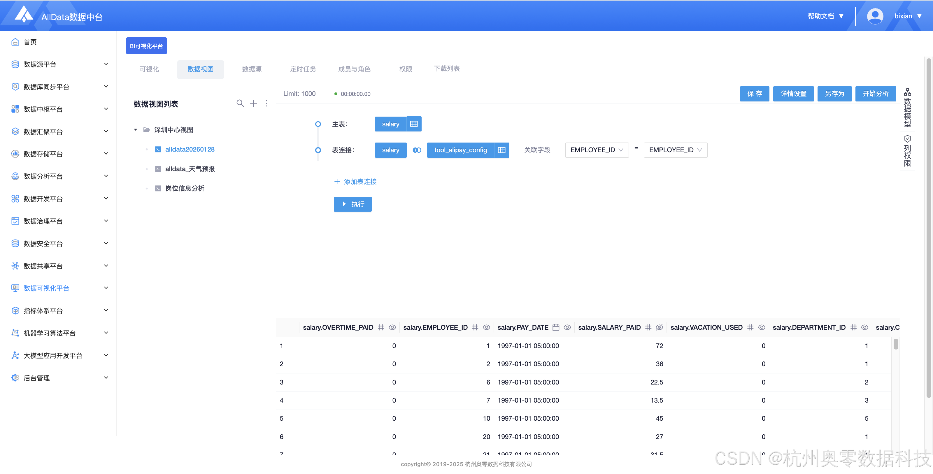 (1)在数据视图中,在左侧数据栏目中选择需要创建视图数据表,在列表中勾选你需要分析的表,如果还需要其他信息,可关联多表。然后点击执行按钮进行表数据分析。![]() |