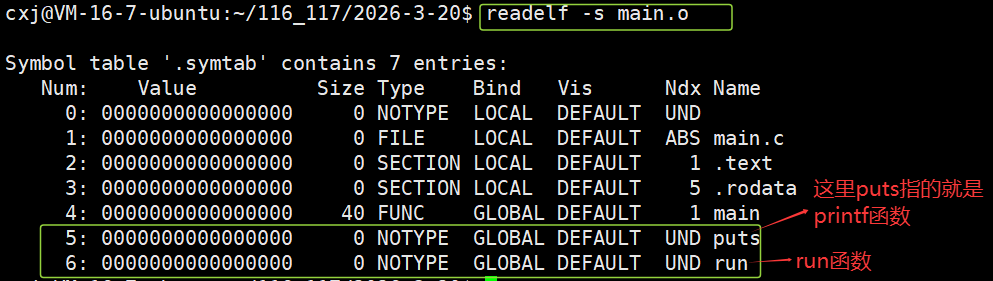 这是 run.c 编译成 run.o 后的符号表,第一个核心符号是 run ,类型是FUNC(函数),全局可见,位于 .text 段(Ndx=1),是 run() 函数的实现符号。第二个核心符号是 puts ,类型也是NOTYPE,全局可见,Ndx=UND(未定义),对应代码0里的 printf("running...\n") (同样被优化为 puts)。