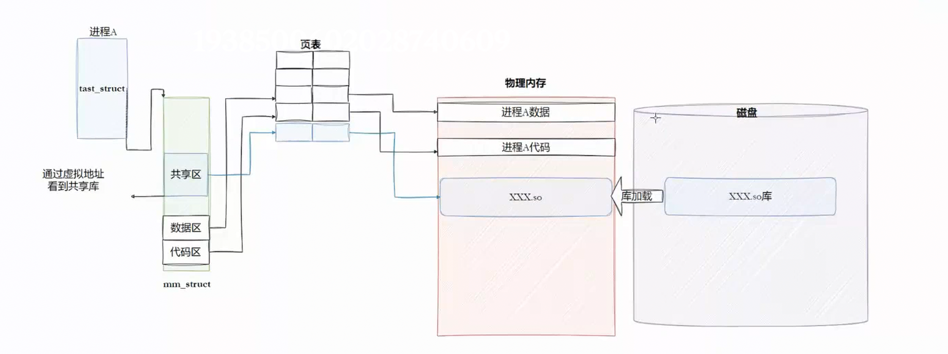 动态库在磁盘上,动态库(.so 文件)本质上就是一个普通的磁盘文件。它开始时静静地躺在磁盘里,和你的 main.exe 一样,只是一堆二进制数据。当进程加载启动后,**内核的动态链接器会把它从磁盘读取到物理内存中。**一旦被加载进内存,它就不再是磁盘上的死文件了,而是变成了物理内存里的一段数据。和普通进程的代码段、数据段一样,都是物理内存里的实体。并且因为它是共享库,系统内存中只会存一份 libc.so ,然后让所有用到它的进程(比如进程A、进程B)去共享这一份内存。下一步就是最关键的一步 : 建立"映射"(MMU + 页表),因为进程A不知道动态库在物理内存的具体位置,所以必须建立映射关系:首先内核建立页表项,操作系统维护一张页表。它会记录:"动态库 XXX.so 在物理内存的第 X 页"。然后内核会给进程A的 mm_struct(虚拟地址空间) 中划分一块区域(共享区)。最后通过页表,把进程A虚拟地址空间里的"共享区",映射到物理内存中存放 XXX.so 的那一页。这样当进程A运行到需要调用 puts 时,程序发出请求执行call puts 。CPU 使用 puts 对应的虚拟地址(属于进程A的共享区)。MMU(内存管理单元)查页表,发现这个虚拟地址对应的是物理内存里的 XXX.so 数据。最终成功访问,CPU 直接去物理内存中读取动态库的代码并执行。