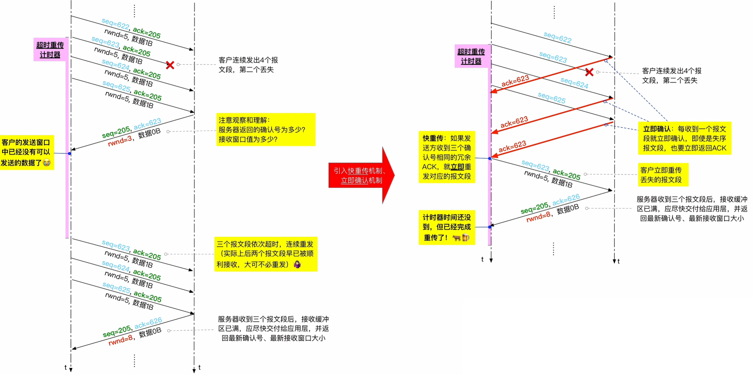 快重传机制、立即确认机制(右图有问题,第一个ACK不能算作冗余ACK,需要再来一个ACK才会立即重传)