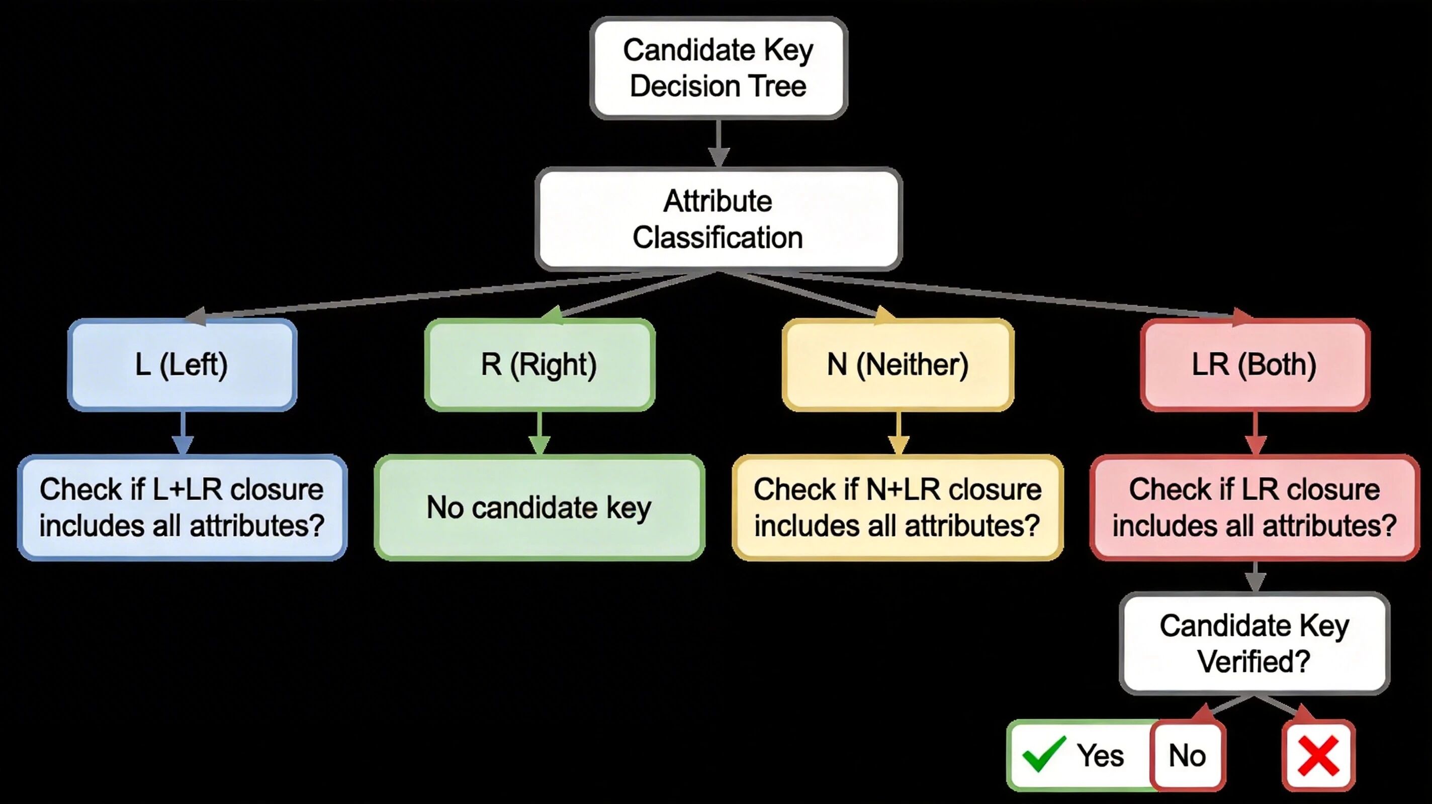 候选码求解决策树图,展示属性分类到候选码验证的完整流程