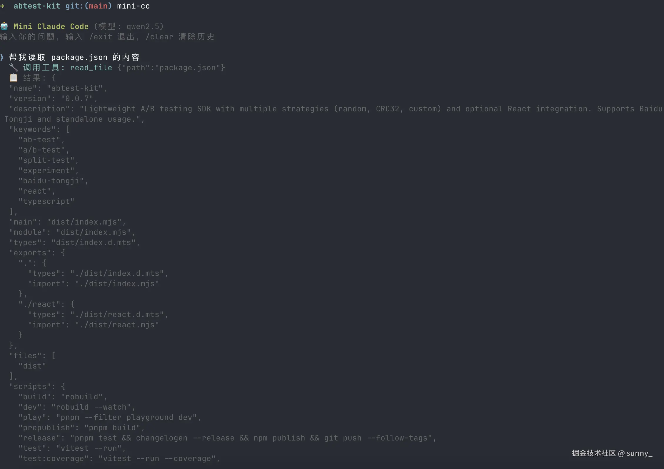 在深入技术细节之前,你可以先花 1 分钟把 mini-cc 跑起来,亲手感受一下"自己的 Claude Code"是什么体验。