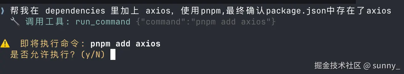 不在白名单中的命令,工具会暂停 Agent 的执行,在终端弹出确认提示: