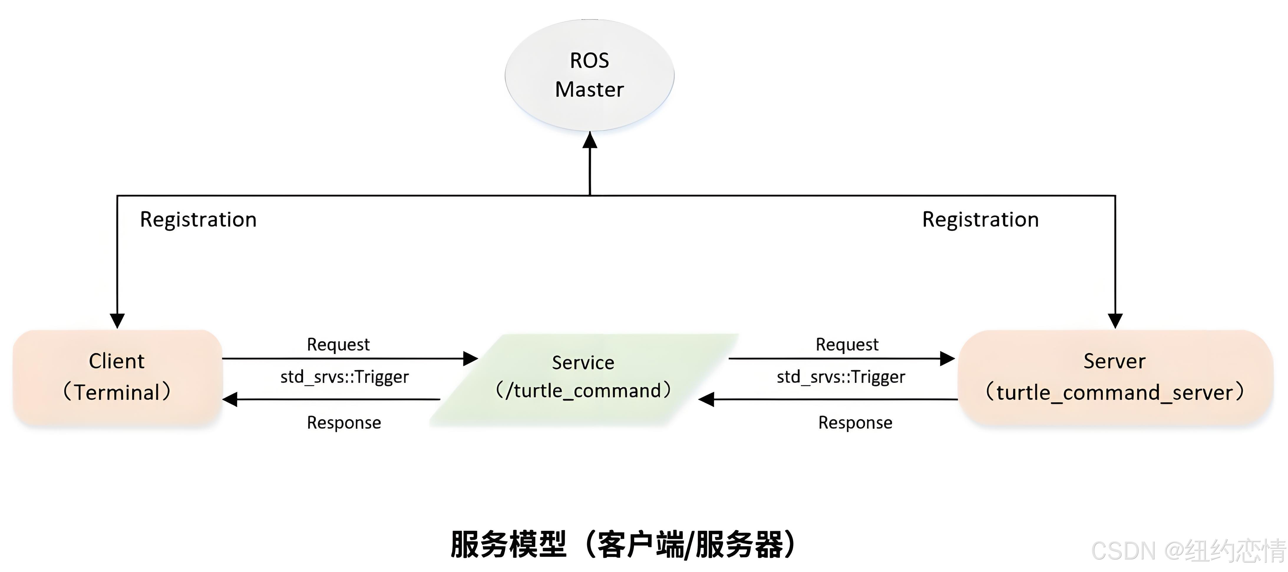 通过自定义名为 /turtle_command 的Service实现,中间传输消息的数据类型为std_srvs::Trigger(一种针对服务标准std_srvs下的数据定义)来通信。Trigger意为触发,通过Trigger信号来触发Server端的运动指令。