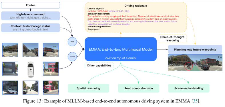- EMMA:提出统一的基于MLLM的框架,将所有非传感器输入(如导航指令和自车状态)和输出(如规划轨迹和3D物体位置)编码为自然语言表示。这种以语言为中心的设计使不同模态和任务能够在单一通用模型架构内无缝集成。