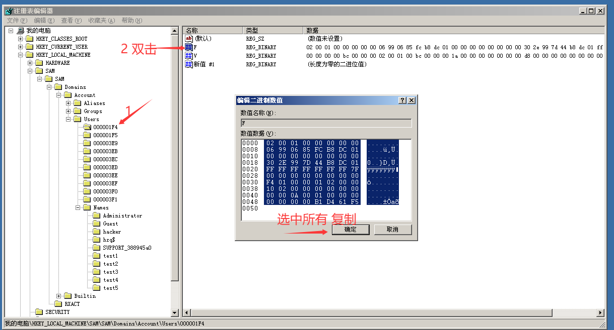 SAM\Domains\Accounts\Users - 找到管理员项: