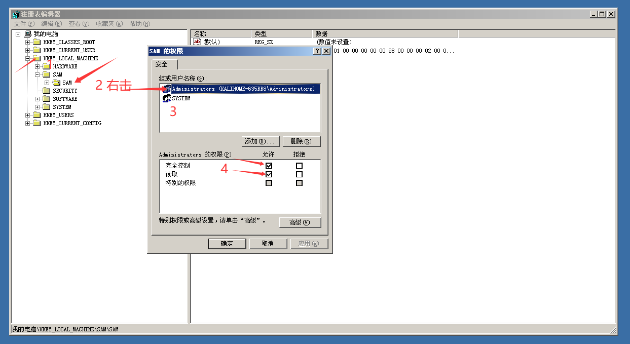 HKEY_LOCAL_MACHINE\SAM\SAM - 右键 → 权限 → 给 Administrators 组完全控制