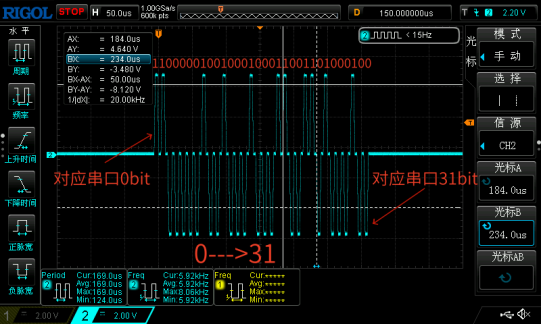 由于串口转ARINC429模块采用透传模式,小端模式(即0bit先发),所以串口数据0x22CC4483转ARINC429后,ARINC429总线上的波形如下图所示: