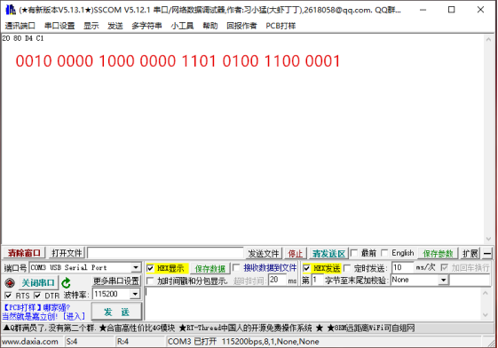 由于ARINC429转串口采用透传模式,小端模式,所以ARINC429转串口后,串口收到数据为0x2080D4C1,如下图所示: