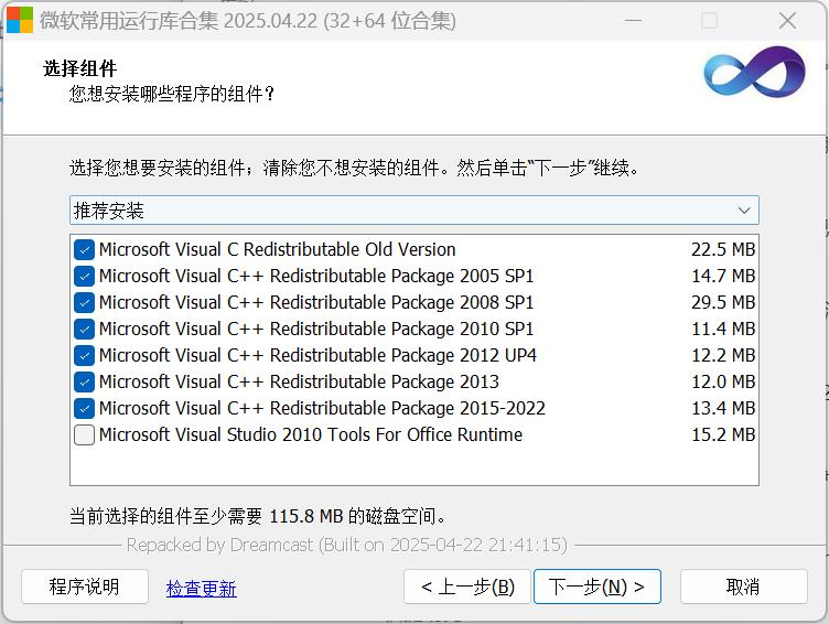 Microsoft Visual C++ Redistributable(简称MSVC,VB/VC,VC运行库)系统运行库是Windows操作系统应用程序的基础类型库的可再发行程序包.Microsoft Visual C++运行库是系统装机必备组件,此版VC++运行库合集(微软常用运行库合集),整合了所有版本Visual C ++,可以自选更新VC++版本组件,并提供图形安装界面.