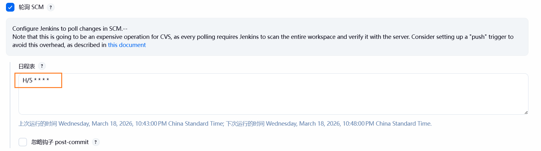 (1)Poll SCM(Source Code Management):定时检查源代码仓库是否有更新,如果发现有更新则自动触发构建: