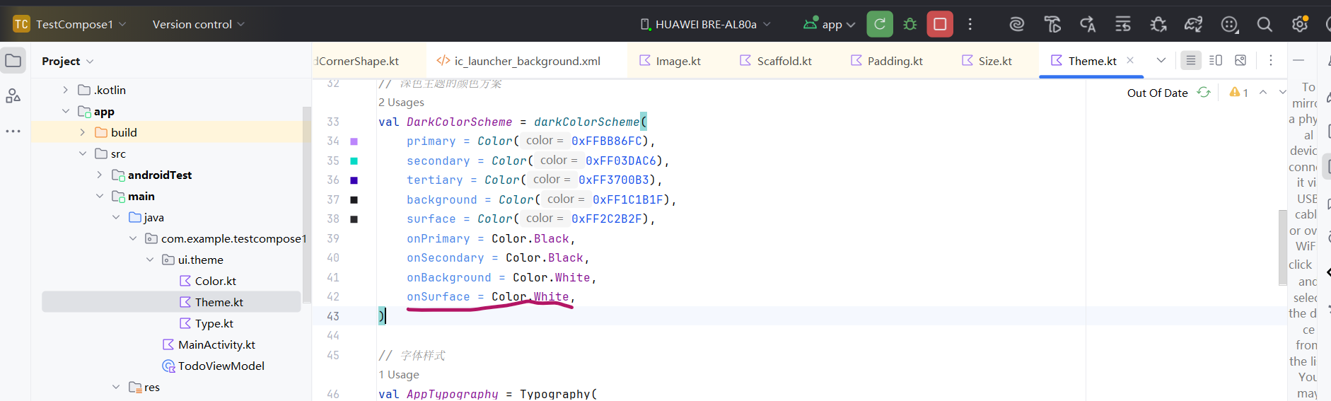 修改上一个demo,使用自定义主题。直接修改Theme.kt, 修改里面的颜色、字体形状的配置。并且创建自定义包装函数,代码如下: