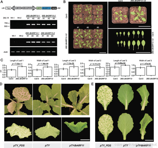 (A)拟南芥中 2×35S‑Pro::BrGRF13 过表达株系的构建,以及转基因植株与未转化野生型植株间 BrGRF13 表达水平的半定量 RT‑PCR 比较,上方数字为 BrGRF13 过表达植株的株系编号。